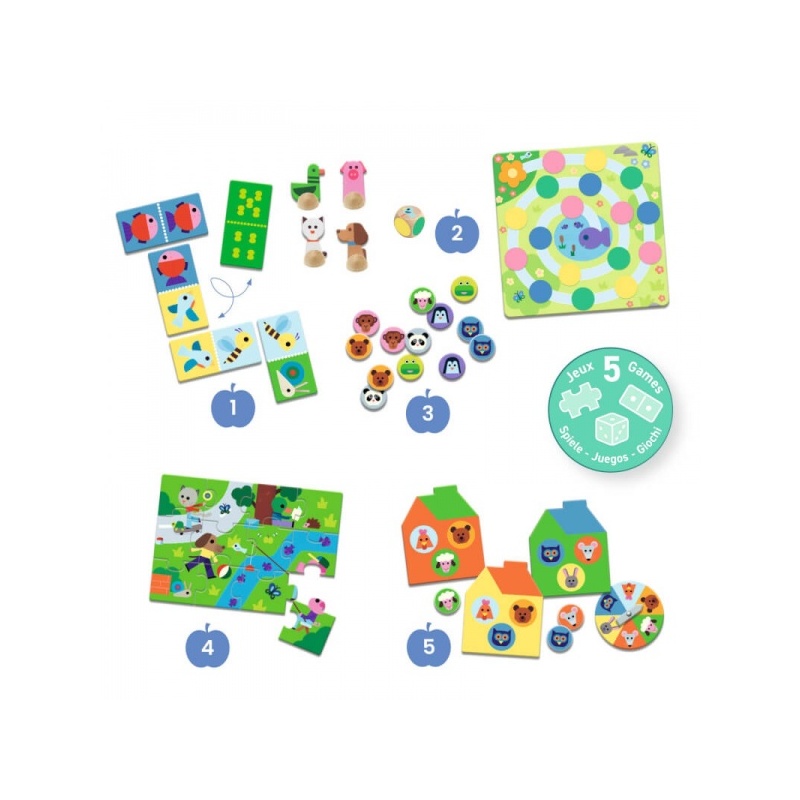 Tõeline mängude aardekast! See viis-ühes komplekt sisaldab klassikalisi arendavaid mänge: memoriin, loto, doomino, 12-osaline pusle ja täringumäng. Lastele pakub see tundide viisi mängurõõmu, arendades samal ajal loogilist mõtlemist, mälu ja tähelepanuvõimet. Kõik mängud on kaunistatud armsate loomade piltidega. Komplekt sisaldab 4 siluetttahvlit, spinnerit, 22 memoriini ketast, 28 doomino klotsi, 12 pusletükki ja palju muud. Sobib vanusele alates 3 aastat. HOIATUS. Ei ole sobiv alla 3 aasta vanustele lastele. Väikesed osad.