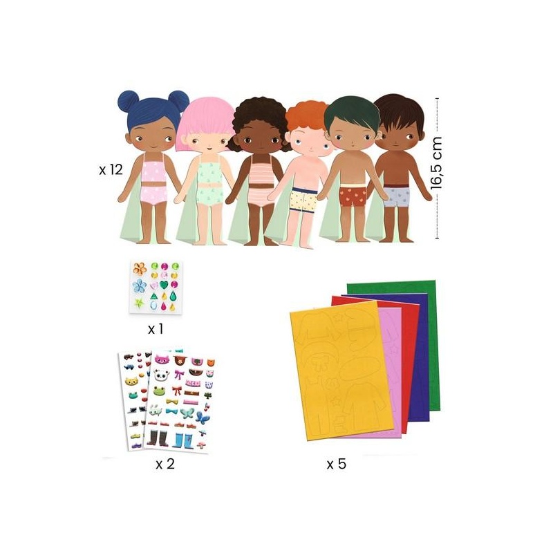 Põnev tegevus nende kaheteistkümne tegelase (kuue poisi ja kuue tüdruku) isekleepuva vildiga riietamisel. Lisage värvi kleepsude ja "kalliskividega". Mängige värvidega ja kombineerige kõikvõimalikke erinevaid tükke.
