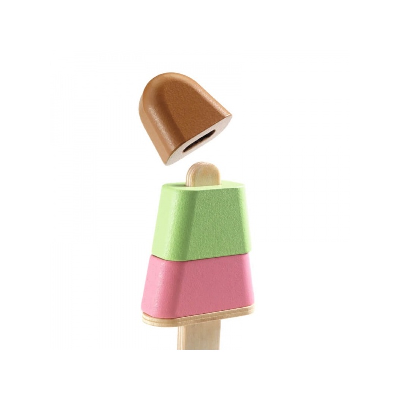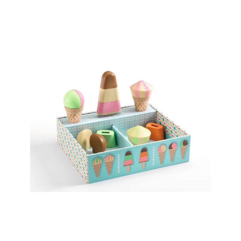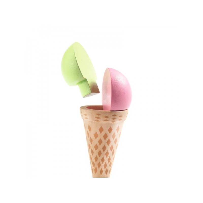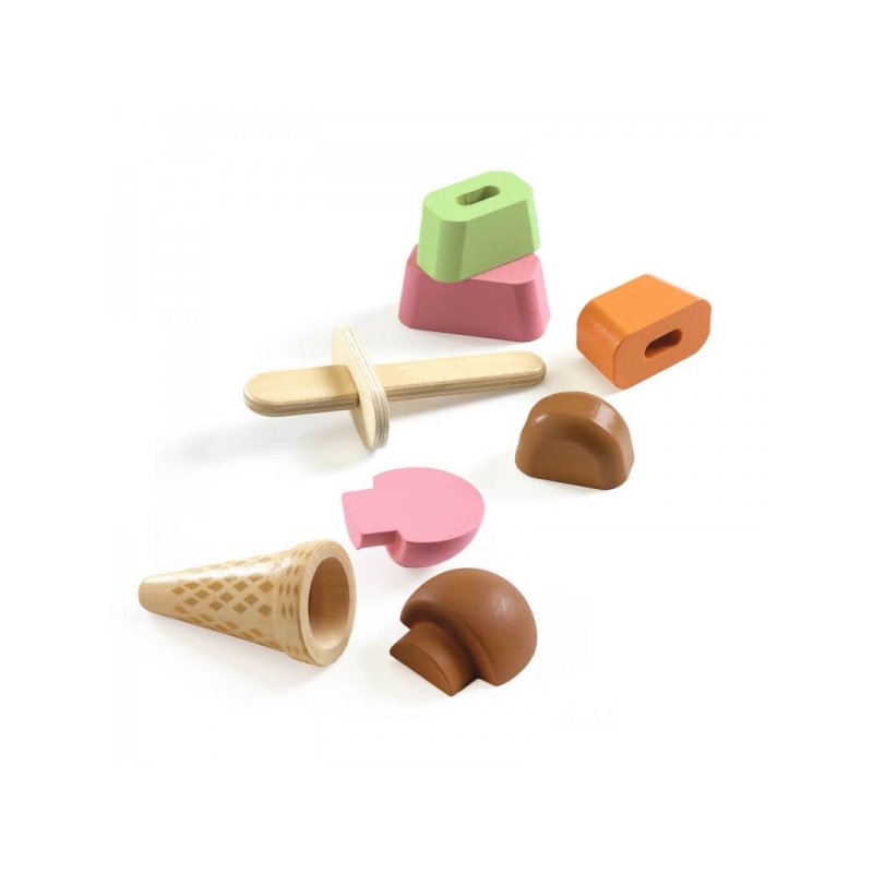 Komplektis on tugev puidust hoiukarp, mida saab mängus kasutada ka avatud müügileti või jäätisealuse rollis, kaks vahvlikoonust, jäätisepulk ja 9 puidust jäätisetükki. Kõik detailid mahuvad mugavalt karpi, mis teeb komplekti hõlpsasti kaasaskantavaks ja hoiustatavaks. FSC®-sertifitseeritud puidust valmistatud mänguasi arendab laste kujutlusvõimet, rollimänguoskust ja peenmotoorikat.