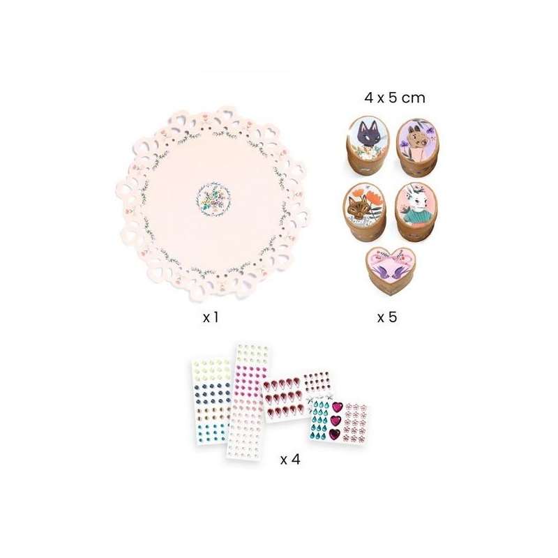 Loominguline komplekt viie minikarbi loomiseks, mida saad kaunistada enam kui 200 isekleepuva vääriskivi abil. Ideaalne kõigi oma väikeste aarete hoidmiseks... Vääriskivikleebiste sädelevad ja pärlmutterdetailid lisavad karpidele õrna puudutuse. Kujundamist vaadake kaasasolevas samm-sammult juhises. Komplektis on ilus illustreeritud salvrätik, mida saab karpide alla panna.